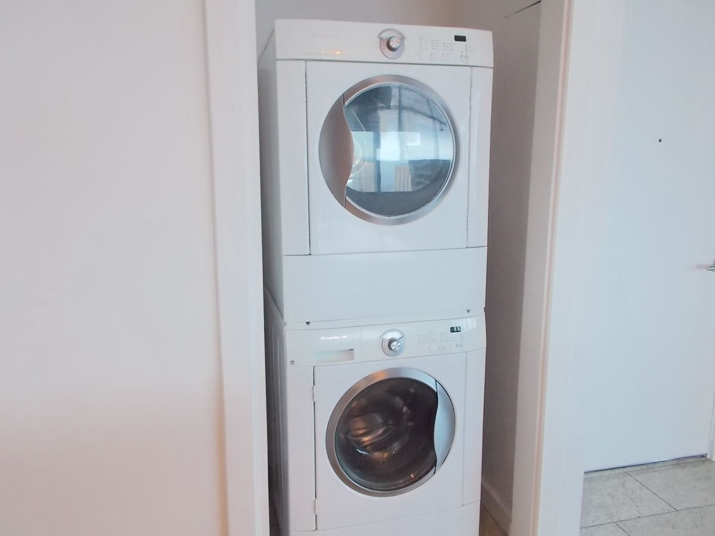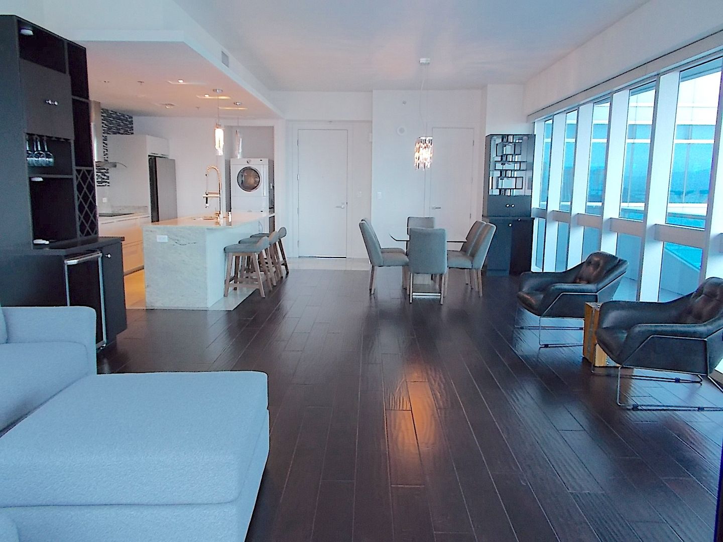 This stunning unit features an open-concept living area with dramatic floor-to-ceiling windows and a private balcony showcasing breathtaking views of the Las Vegas Strip. The modern kitchen is appointed with stainless steel appliances, stone countertops with full backsplash, sleek contemporary cabinetry, tile flooring, and a spacious island accented by recessed lighting and two elegant glass pendant fixtures. A conveniently located stackable washer and dryer are tucked neatly into a kitchen-adjacent nook for added ease. Bedroom one offers floor-to-ceiling windows, a queen-sized bed, and a mounted television. The connected hall bathroom features tile flooring, recessed lighting, and a glass-enclosed tile shower with Strip views. The primary suite includes plush carpeting, a queen-sized bed, and television. The en-suite bath is designed with double sinks and a walk-in shower. Enjoy luxury high-rise living just steps from the heart of the Strip, with world-class dining, entertainment, and shopping moments away.