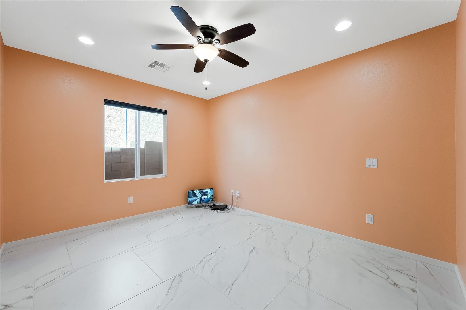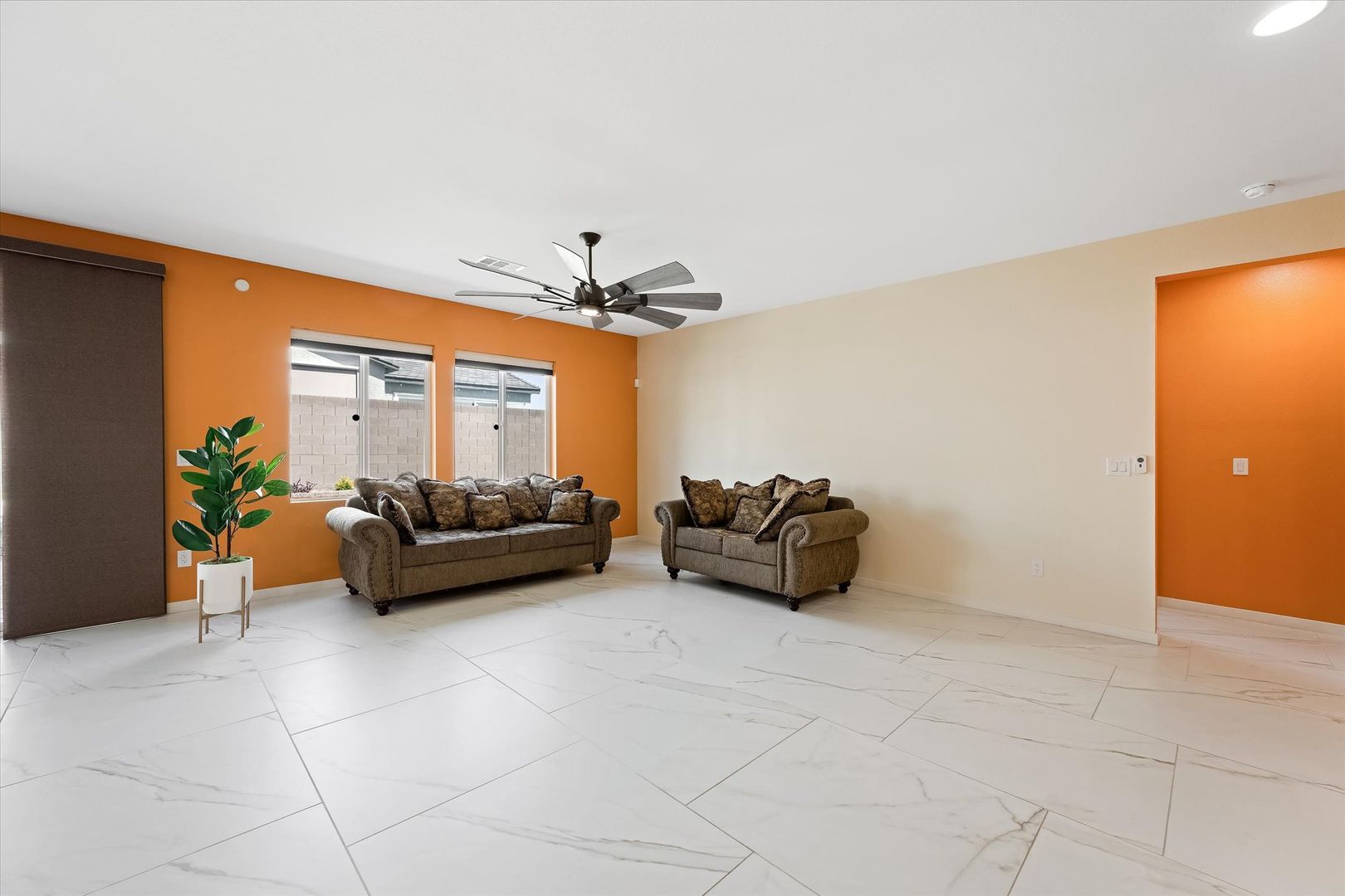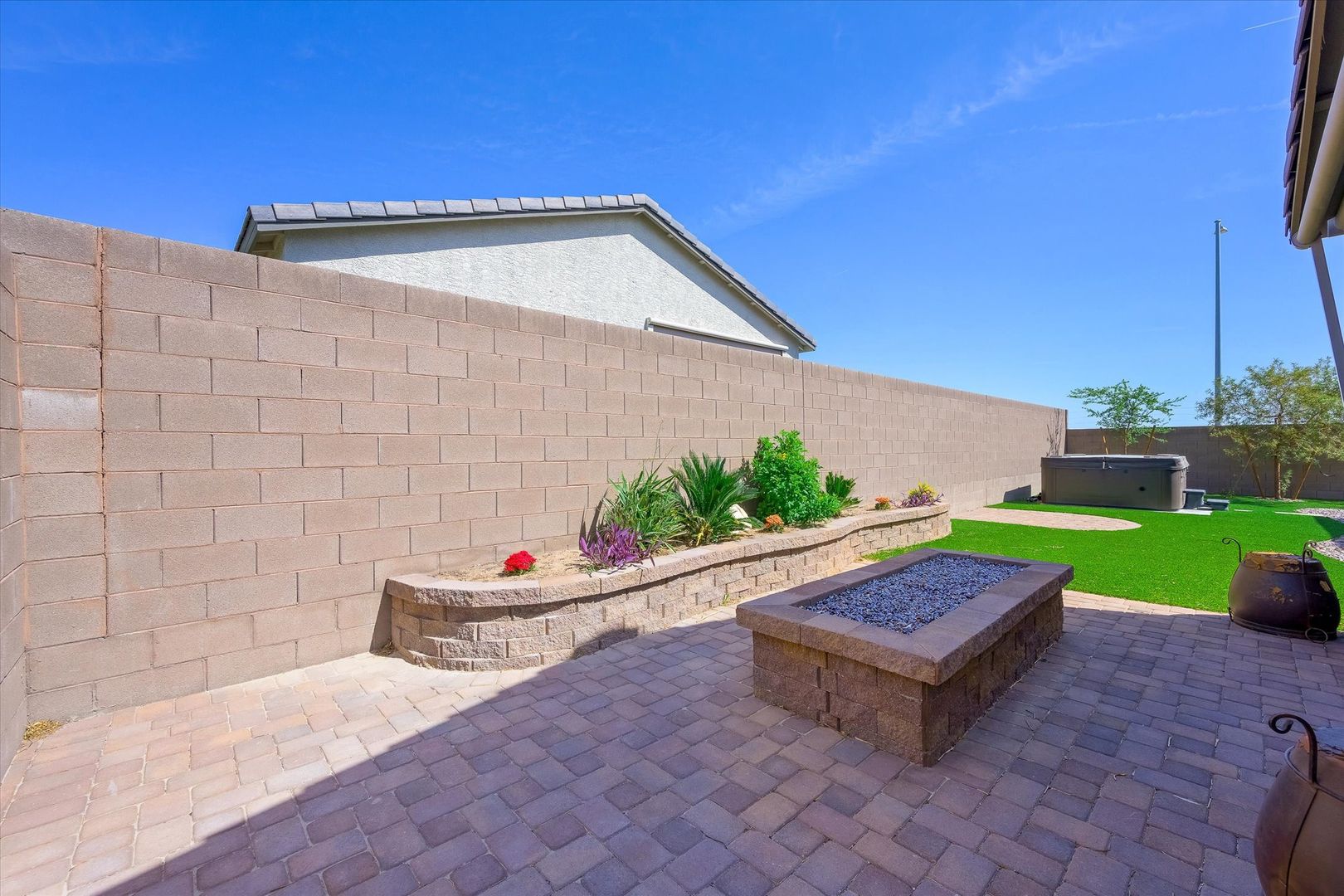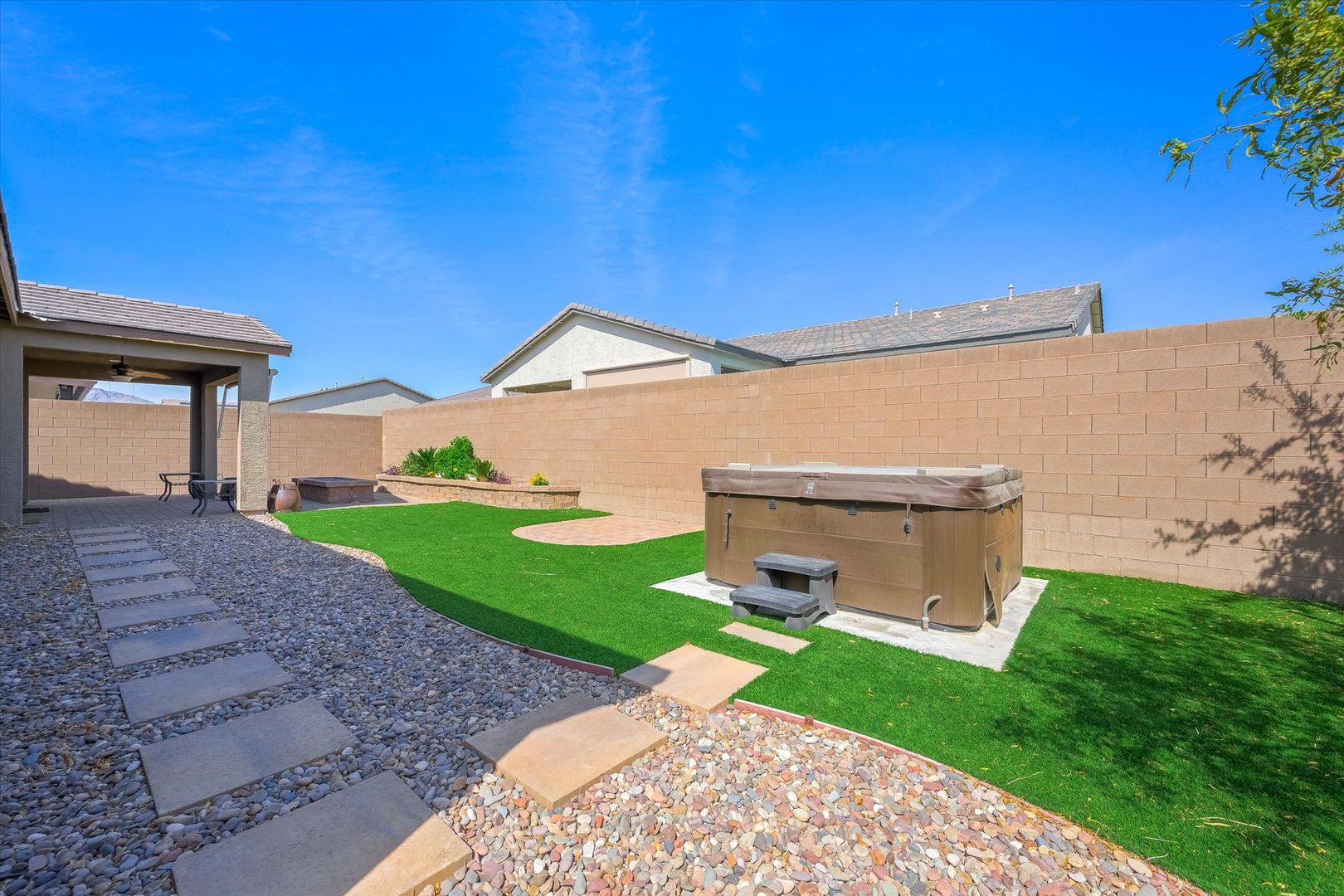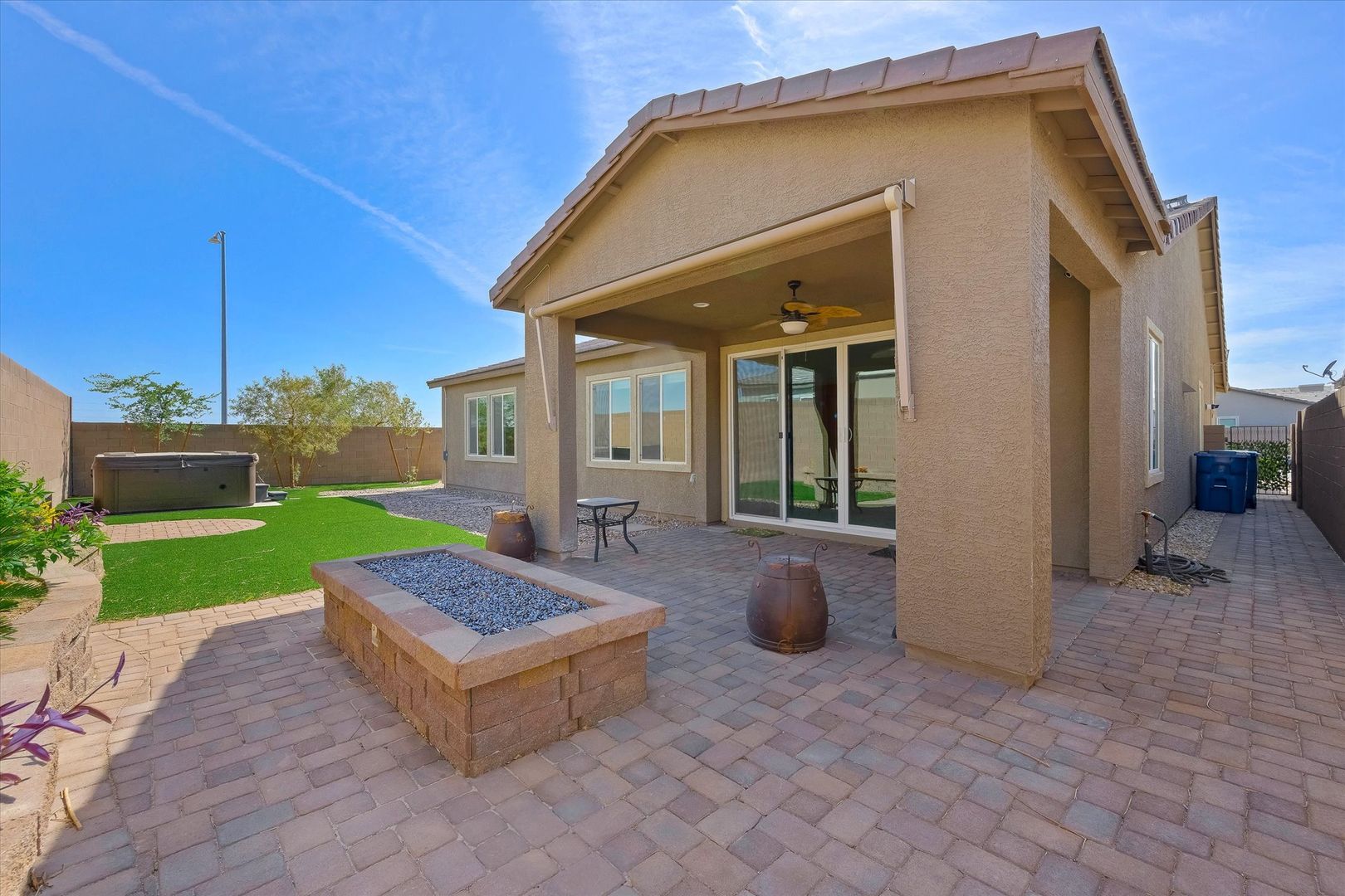 Located on a desirable corner lot within a well-maintained gated HOA community, this spacious single-story home offers 4 bedrooms, 3 bathrooms, and a 2-car garage. The open floor plan is perfect for entertaining, featuring a gourmet kitchen with stainless steel appliances, granite countertops, recessed lighting, tile flooring, a breakfast bar, and a large center island with pendant lighting. The home includes ample-sized bedrooms, including a private casita ideal for guests or a home office. Laundry room has a sink and plenty of cabinets for storage space. The backyard is perfect for relaxing or entertaining, complete with a covered patio, hot tub, fire pit, and beautifully manicured landscaping in both the front and back yards. Conveniently located near dining, entertainment, and public transit, this home combines comfort, style, and accessibility.