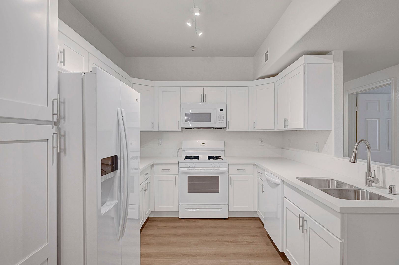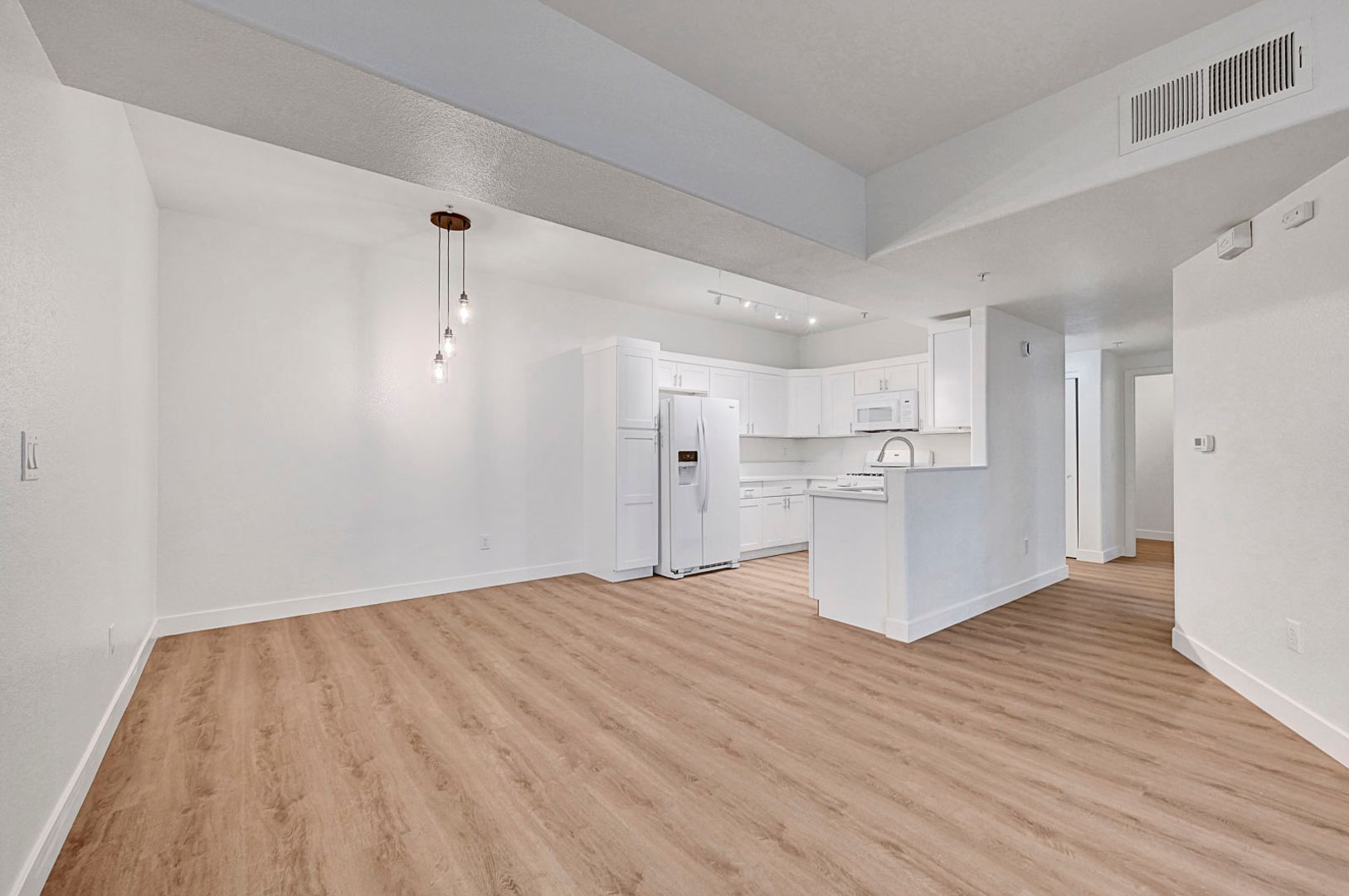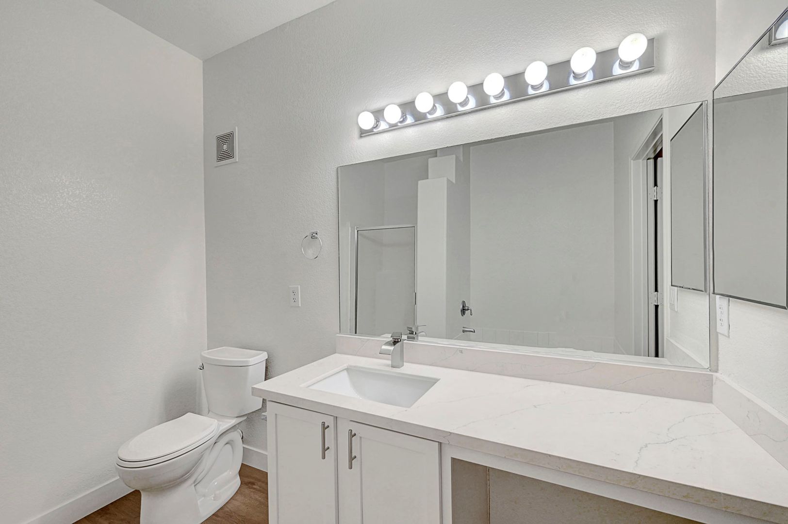Recent upgrades include wood-look plank flooring throughout and a completely redesigned kitchen equipped with quartz countertops, modern cabinetry, and upgraded appliances. Both bathrooms have been refreshed with new countertops, sinks, and toilets for a clean, contemporary finish.
